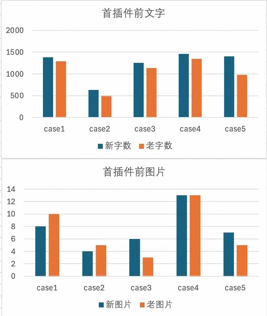 虽然样本不多但代表了不同客户的主推爆文,可以看到新内容的插件前字数普遍比老内容长了10%左右、但前置配图则有多有少,所以插件前的总内容篇幅相比老版本有长有短、整体趋势偏长。