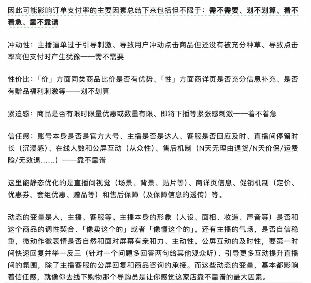 关于「信任感」,搜我公众号之前写过很多,包括前两年做直播时也写过「提升直播间订单支付率的关键还是信任感」。内容营销都是相同的,或者说效果营销都是相同的,优化内容、和优化直播间、优化广告落地页都一样,只不过图文和落地页更像是线性浏览、所以信任和刺激交替加强的结构逻辑很重要,直播间则是多模态并发所以信息量更重要。