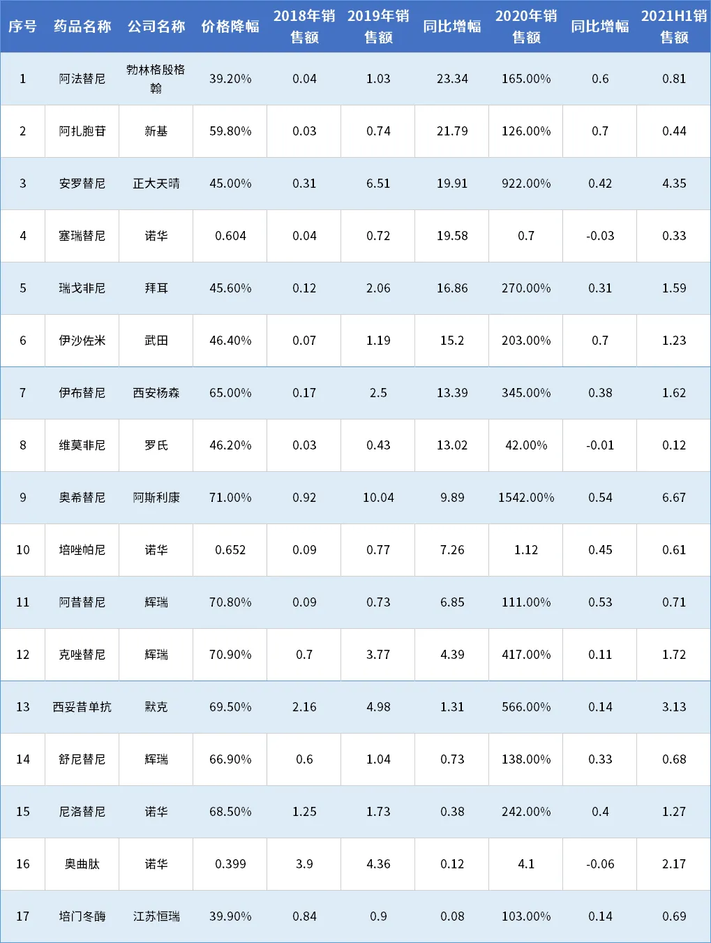 以2018年医保谈判品种来看,最终谈判成功的17个品种,平均降幅57%,全部实现了正增长,第一年销售额平均增幅高达1024%。