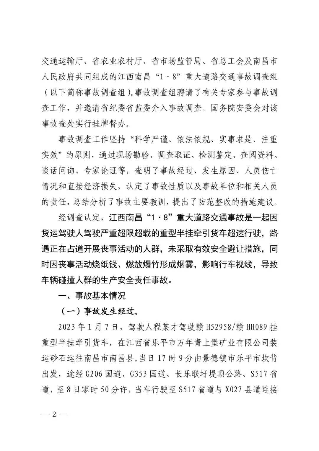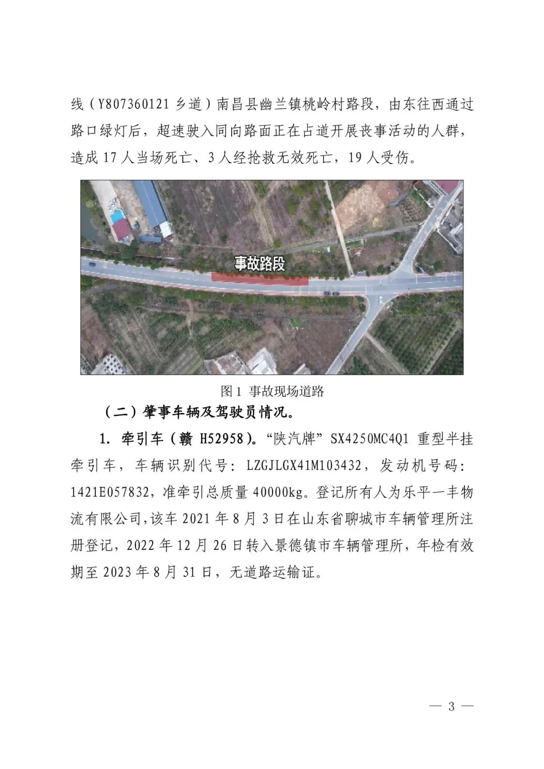 2023年1月7日,驾驶人程某才驾驶赣H52958/赣HH089挂重型半挂牵引货车,在江西省乐平市万年青上堡矿业有限公司装运砂石运往南昌市南昌县。在南昌县幽兰镇桃岭村路段,程某才超速驶入同向路面正在占道开展丧事活动的人群,造成17人当场死亡、3人经抢救无效死亡,19人受伤。