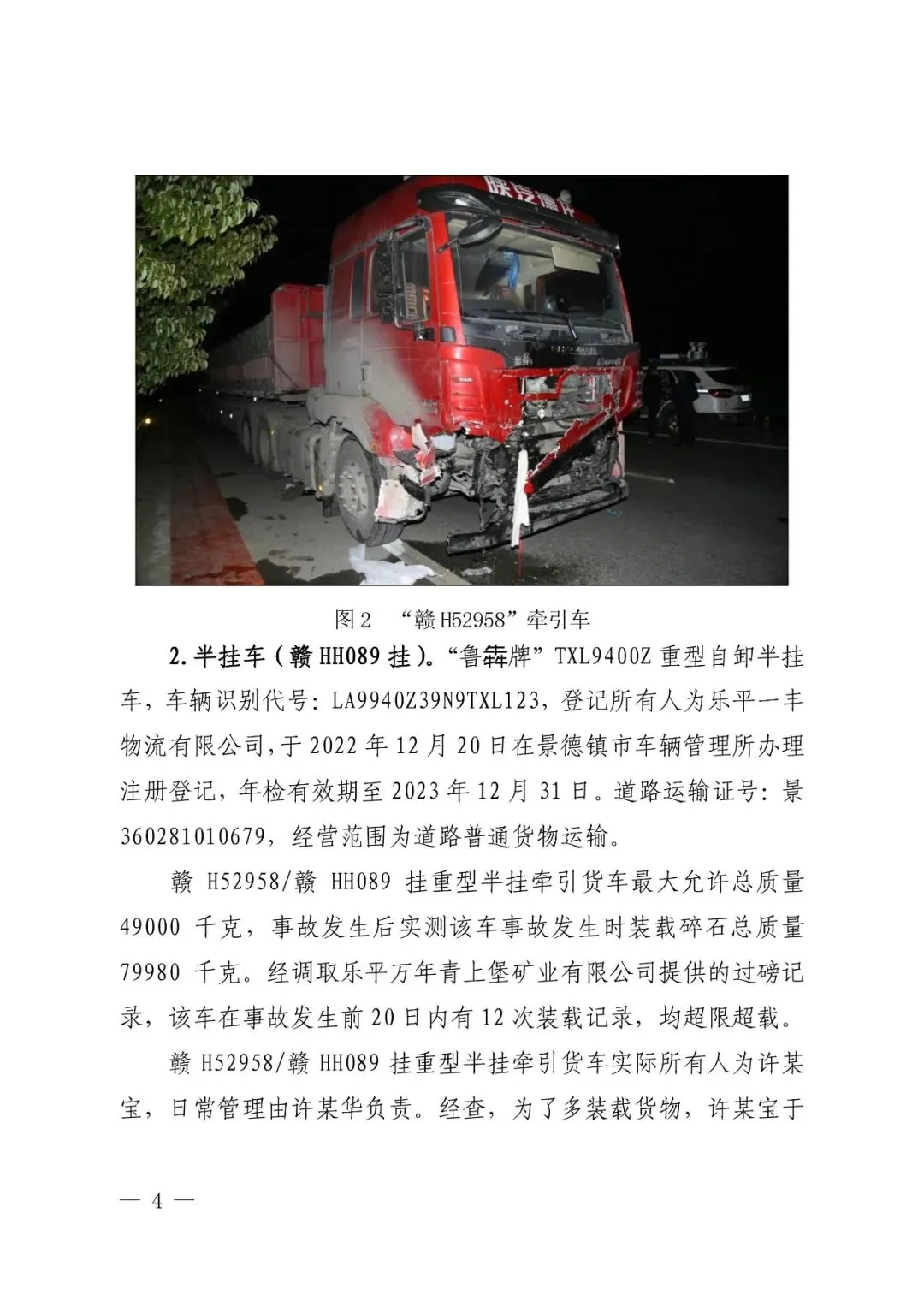 赣H52958/赣HH089挂重型半挂牵引货车最大允许总质量49000千克,事故发生后实测该车事故发生时装载碎石总质量79980千克。经调取乐平市万年青上堡矿业有限公司提供的过磅记录,该车在事故发生前20日内有12次装载记录,均超限超载。