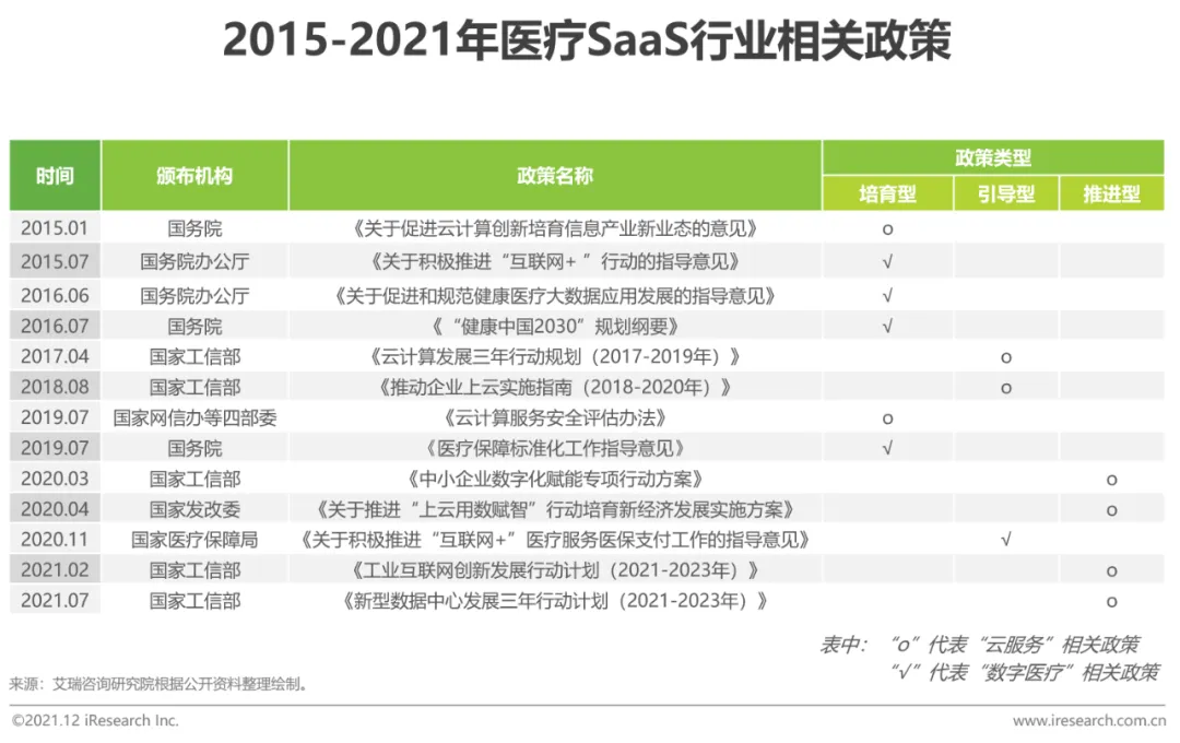 云服务相关政策类型逐渐由早年供给端产业培育演变为需求端应用推进型;相关政策发布愈发频繁,预计相关产业落地政策将会被更高频次的提出。医疗领域的相关政策略微滞后,目前以产业培育型政策为主,其主要是出于对院内核心数据上云的审慎考虑。但是非院内场景的SaaS应用与云服务政策的安全性和接受度持续增强,云服务整体快速发展带动医疗SaaS行业发展进入“高速赛道”。