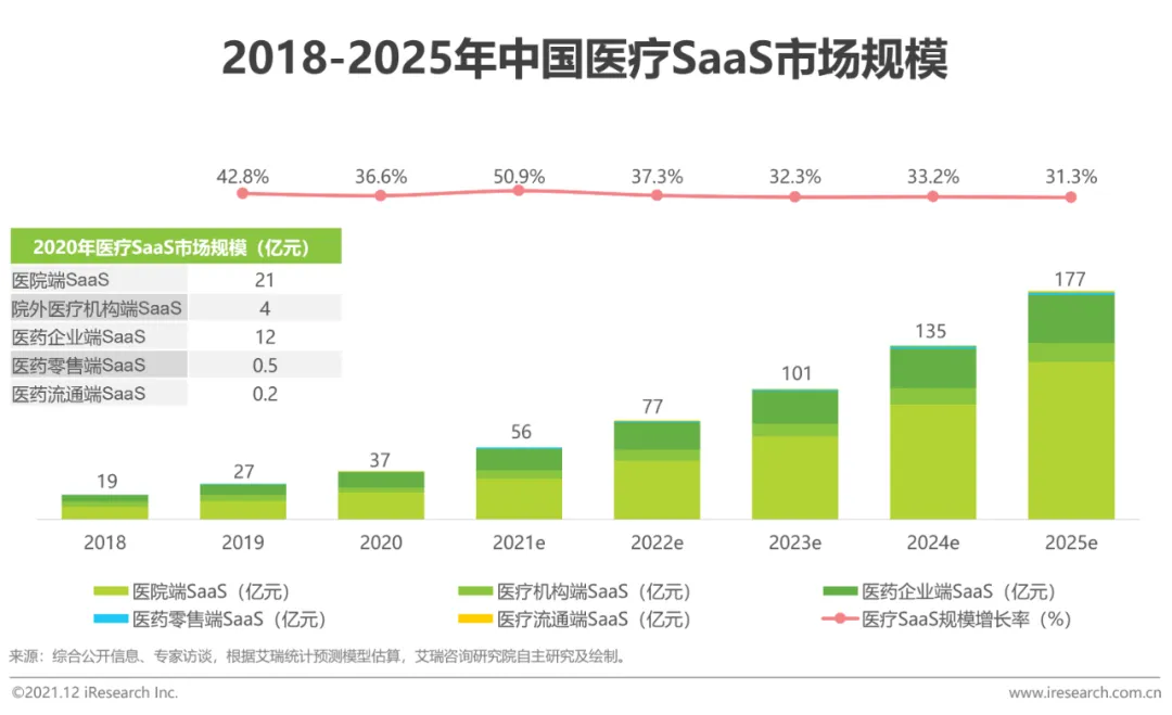 发展规模:2020年中国医疗SaaS行业规模达37亿元人民币。行业整体将保持高速增长,预计在未来五年内,行业增速将持续保持30%以上。艾瑞推算,到2025年,中国医疗SaaS行业规模将达177亿元人民币。