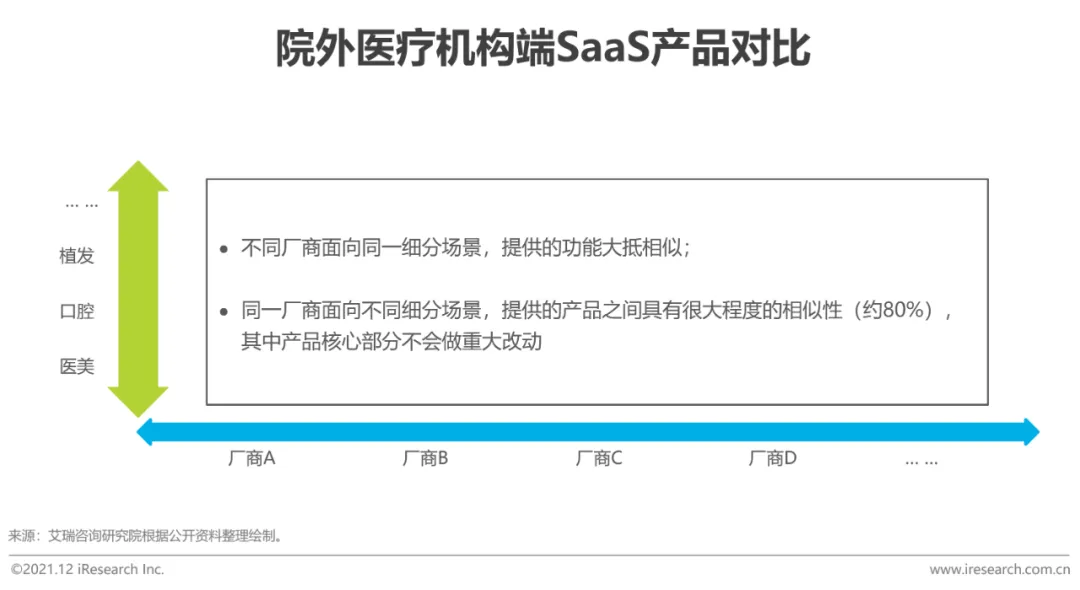 院外医疗机构端SaaS厂商对垂直行业围绕运营与服务提供大抵相同的实质性功能,用以协助院外医疗机构运作。而适用于不同细分赛道的SaaS产品具有功能需求上的可迁移性。不同场景之间的功能差异主要来自于两方面,一个是不同医疗场景服务项目及项目流程的差异;另一个是不同场景存在业务流程的差异,如医美前端有医美咨询这一环节。此种差异性不涉及到SaaS产品核心部分的重大变动,部分业务复杂性高、需要快速响应的场景对后台算力与带宽有更高的要求。在定价方面,不同厂商相同功能产品具有同质性,定价围绕市场价格变化不大。