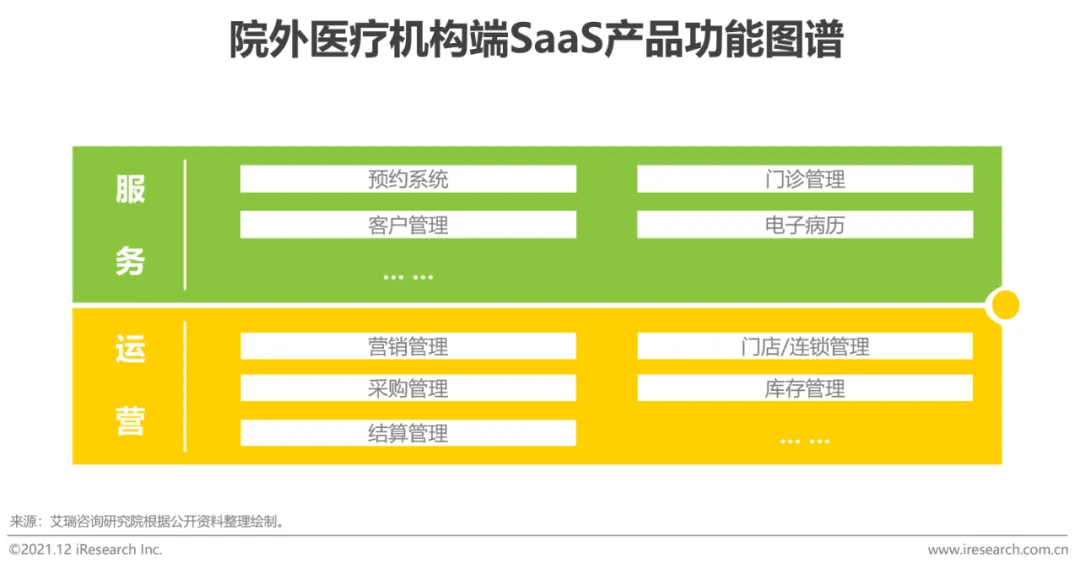 市场差异性来自于对应细分市场客户的市场结构与支付能力。一方面,面向不同细分行业的同样功能产品价格差别较大;另一方面,不同细分市场对应不同的市场结构,也对应着不同的细分市场发展空间。院外医疗机构端SaaS产品目前多为传统软件厂商在细分行业深耕多年的成果。研发基础强的厂商可以基于原有积累对目标行业进行快速产品开发,并向优质市场进军。目前来看,对于优质市场的竞争已由产品竞争延伸至服务竞争,部分厂商开始通过加大服务力度抢占优质市场。