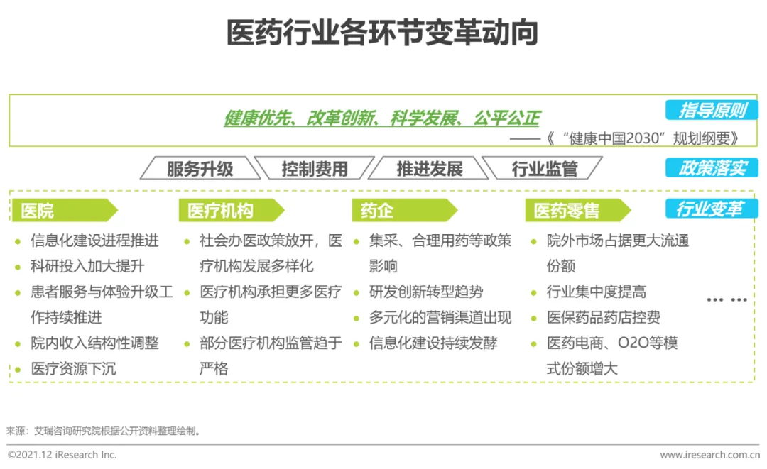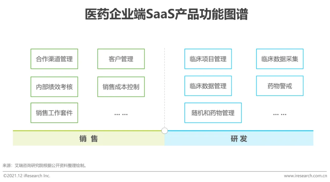 近年,国家对于民生行业,如住房、教育与医疗高度重视,本轮政策推行力度及影响不容小觑。目前来看,“4+7”带量采购、一致性评价、DRGs医保控费等政策持续出台,影响传递至医药行业。一方面,仿制药利润所受影响最为明显,本轮改革下医药企业具有更强药械研发的动机;另一方面,利润率降低倒逼药企销售模式的优化与改革。艾瑞认为,转型压力之下,医药行业将聚焦于销售模式优化与研发效率提升上,而这两个环节有源源不断的数据流入与大量的数据沉淀,对业务数据打通、智能决策上具有强烈需求,医疗SaaS厂商以销售、研发两个环节进行产品开发。