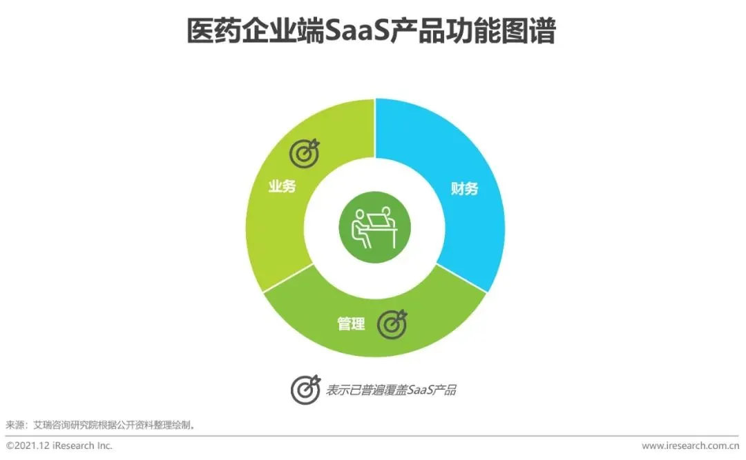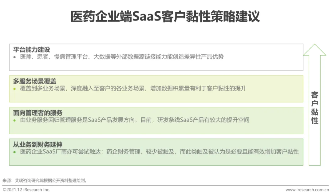 随着医药企业数字化的进程推进,医药企业与医疗SaaS合作模式更倾向于长期、稳定的“共生模式”。因此,保持与医药企业的深度合作、保持高客户黏性是医药企业端SaaS产品发展的根基。艾瑞认为,医药企业端SaaS厂商可通过平台能力建设、完善产品的覆盖场景、增加面向管理者的服务能力,亦可尝试触达企业财务场景,如将业务服务与财务系统链接以提高客户黏性,从而实现医药企业端SaaS厂商的服务能力的纵深发展。
