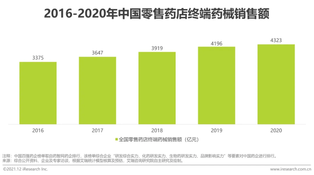 医药销售是医药企业的重要环节,企业对销售环节投入巨大,2020年中国百强药企平均营销费率在30%-50%之间。处方外流等政策推动院外药械销售市场份额提升,而零售药店是整个院外医药销售的重要渠道,2020年中国零售药店终端销售规模达4323亿元,实体药店占比超90%。艾瑞认为,医药零售分布零散,对于医药零售端SaaS厂商进入逻辑在于:1)可通过入门级产品价格与资源搭载优先切入至零售药店,积沙成塔逐渐铺开局面;2)形成零售大数据产品提供给医药企业;3)直接/间接协助药械的营销推广。