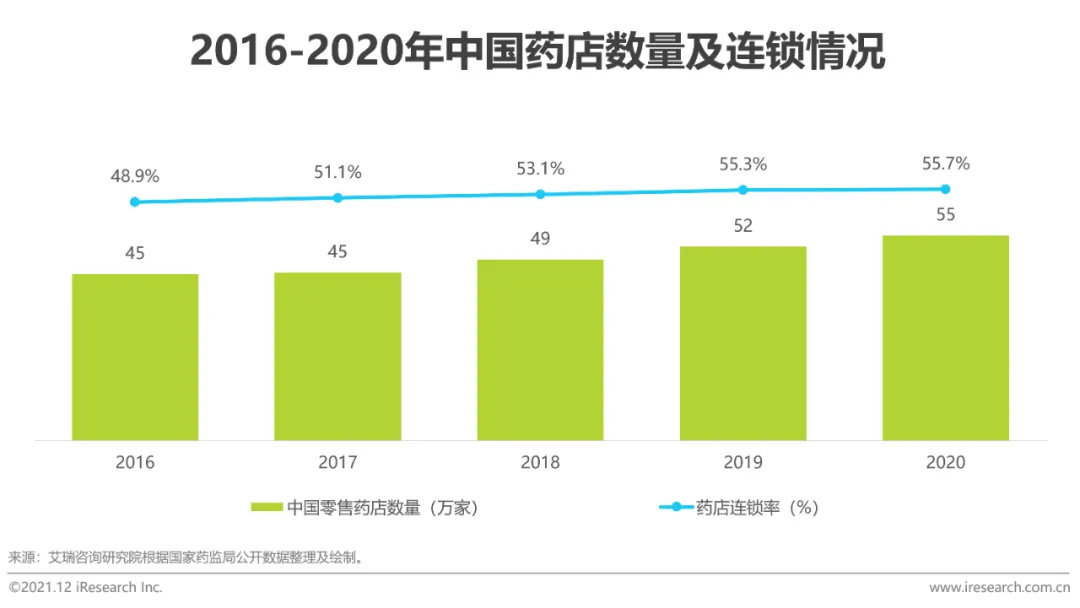 2020年我国零售药店数量达约55.4万家,连锁化率达55.7%。行业开放与市场需求增加双重驱动中国零售药店数量持续增长。同时,医药电商、医药O2O等新兴购药渠道份额迅速提升,零售药店经营者面临外部压力增强,医药零售端SaaS能够协助完善零售药店能力建设(从前端获客到后端管理)。在行业集中度提升与数字化转型两大趋势的推进下,医药零售端SaaS产品覆盖率将持续提升。