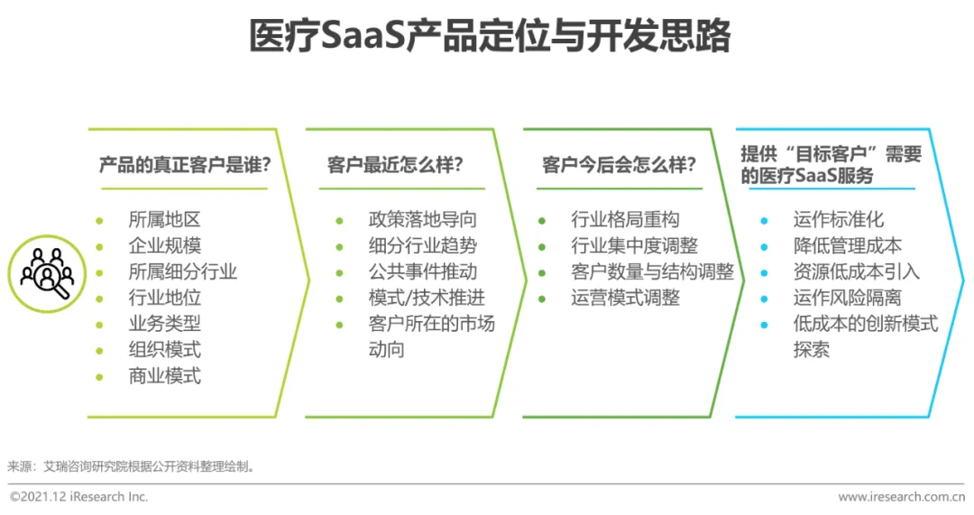 目前,部分医疗SaaS产品存在覆盖定位不够精细的情况,然而此类产品与深度的企业陪伴之间存在一定程度的互斥。艾瑞认为,医疗SaaS产品应该将真正的目标客户聚焦到由多个具体标签组成的客户画像中,而不是盲目的广泛覆盖。基于具体的客户画像去做分析,通过了解客户正在经历的政策、市场、社会事件等外部环境变化去做医疗SaaS客户市场的需求推演以及趋势判断。最后,将客户的需求与医疗SaaS的产品功能进行结合,通过向目标客户持续输出需要的医疗SaaS服务,医疗SaaS厂商才能在市场中持续保持优势。