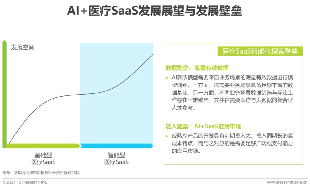 仅有基础模块医疗SaaS产品的客单价与市场成长空间有限,AI技术的应用可给医疗SaaS带来更广阔的成长空间和产品附加价值。目前,已有AI+CDSS(SaaS)、AI+EMR(SaaS)等一系列产品落地。然而人工智能与医疗行业的探索具有一定壁垒,其主要包括:数据壁垒与应用市场壁垒。医疗SaaS行业发展过程中有大量数据沉淀,对医疗场景中,AI训练所需数据的短缺现象进行有效支撑。AI与医疗SaaS发展相辅相成,在未来二者结合更加紧密。