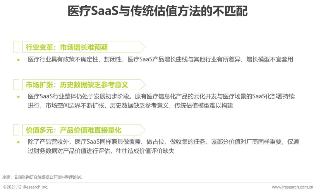 对于具有快速裂变的新业态,以医疗SaaS厂商为例,现阶段不可仅从财务角度进行厂商价值评估。艾瑞认为,从场景卡位、数据入口、数据收集、数据治理及未来可辐射的市场空间等角度全面评估,重点关注其行业价值更为合理。