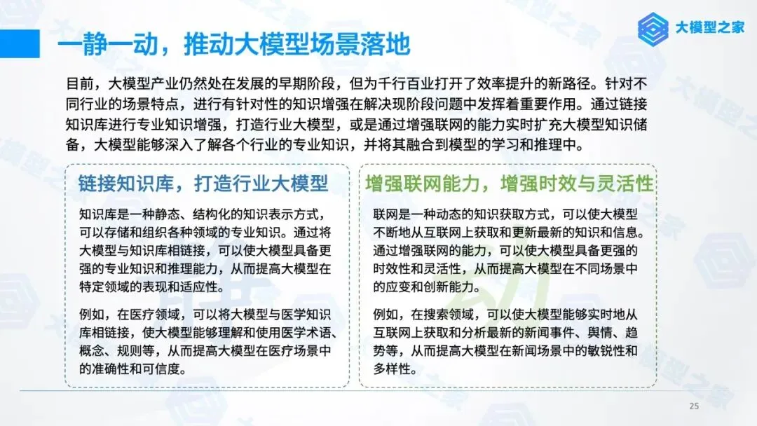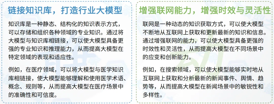 同时,《报告》还结合当下大模型产业发展格局指出现阶段大模型落地的两大路径。针对不同行业的场景特点,进行有针对性的知识增强在解决现阶段问题中发挥着重要作用。通过链接知识库进行专业知识增强,打造行业大模型,或是通过增强联网的能力实时扩充大模型知识储备,大模型能够深入了解各个行业的专业知识,并将其融合到模型的学习和推理中。