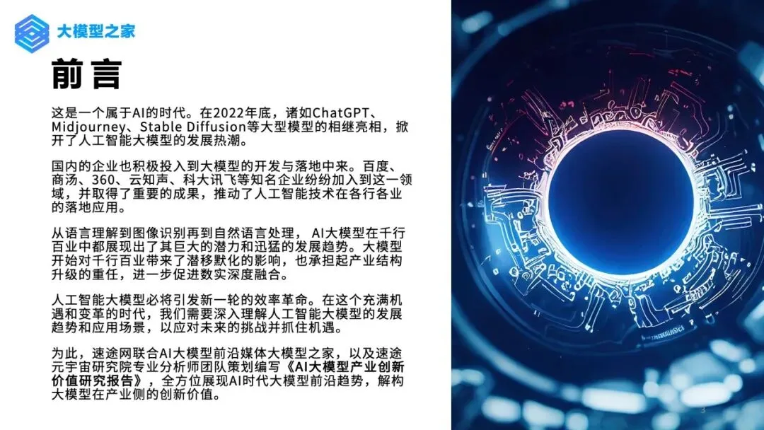 为此,速途网联合国内AI大模型前沿媒体大模型之家,以及速途元宇宙研究院专业分析师团队。联合发布《AI大模型产业创新价值研究报告》(以下简称“《报告》”),全方位展现AI时代大模型前沿趋势,解构大模型在产业侧的创新价值。