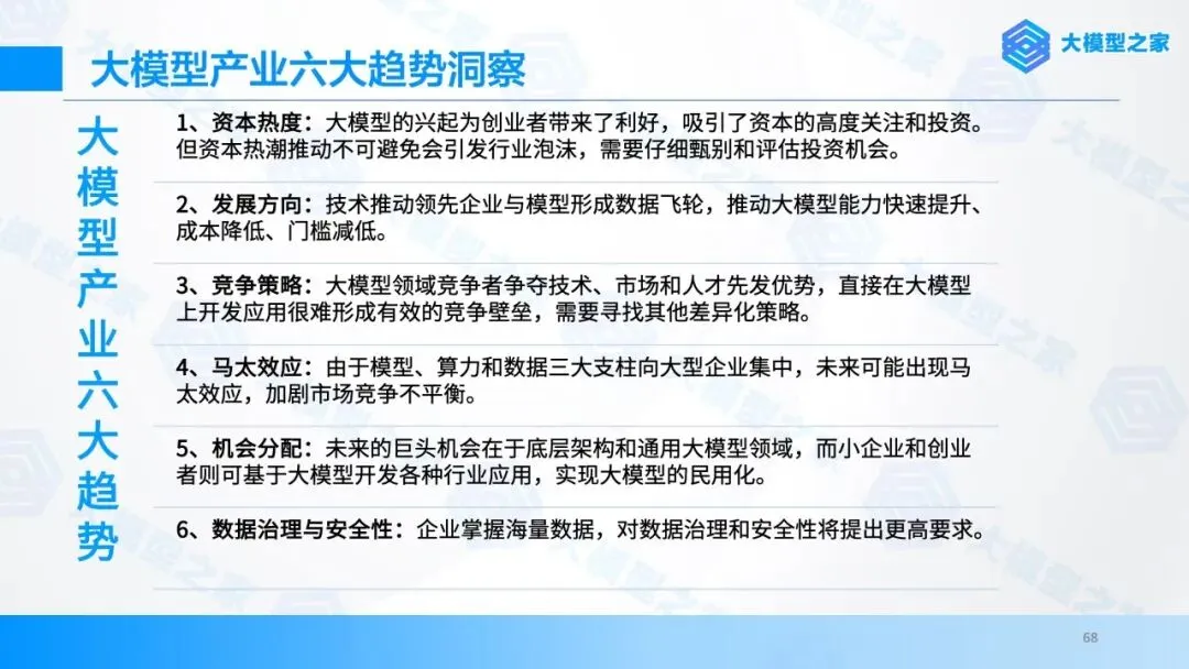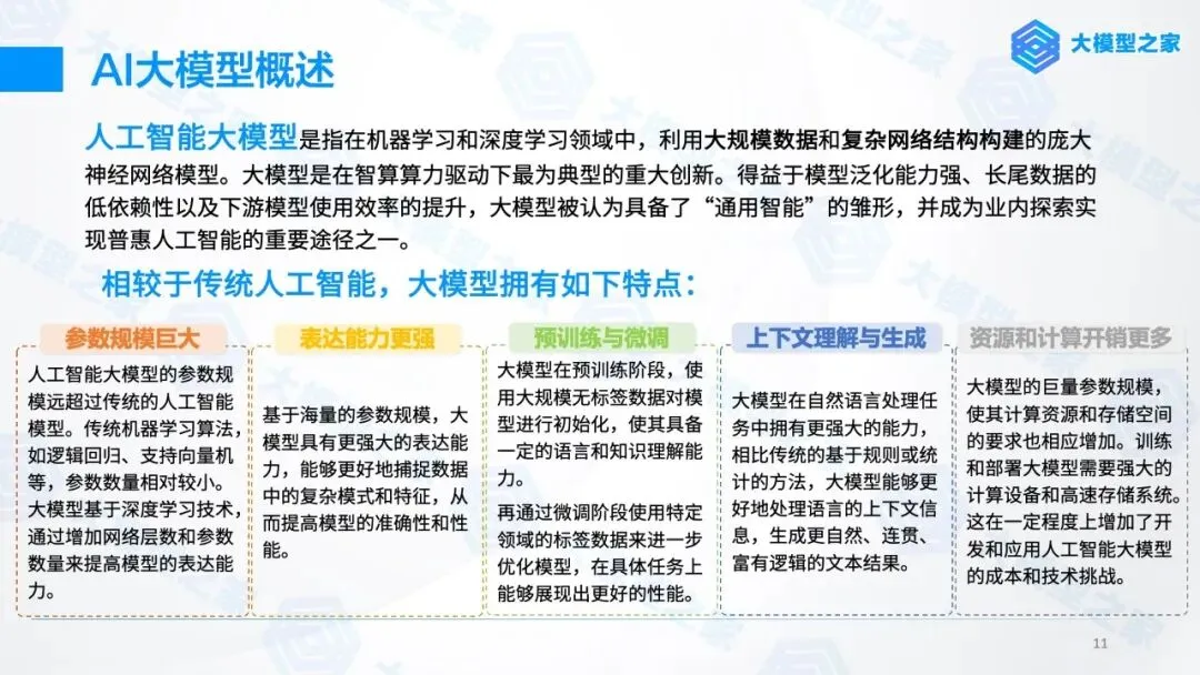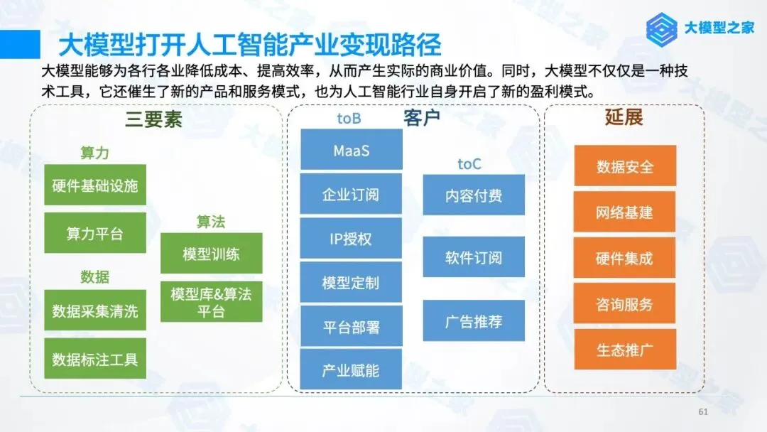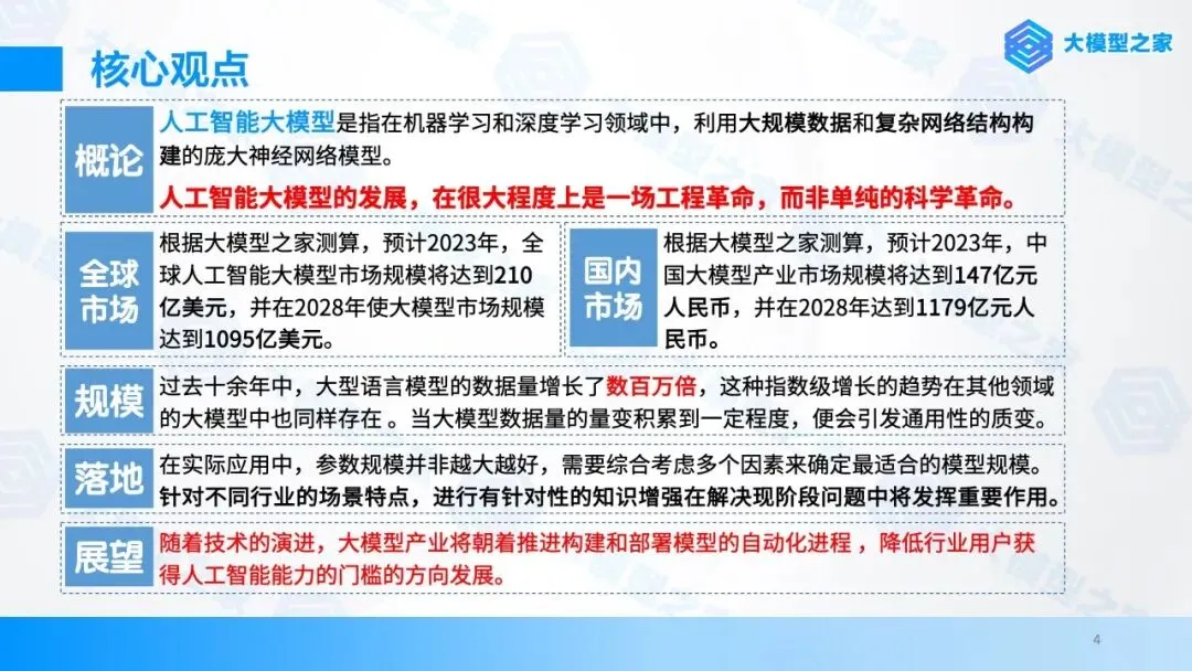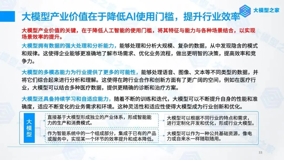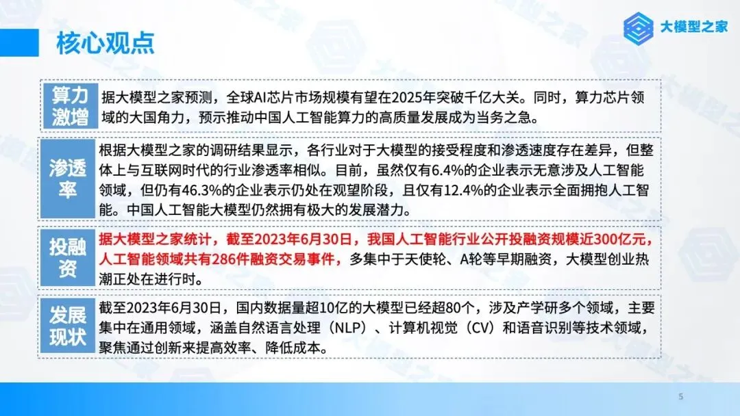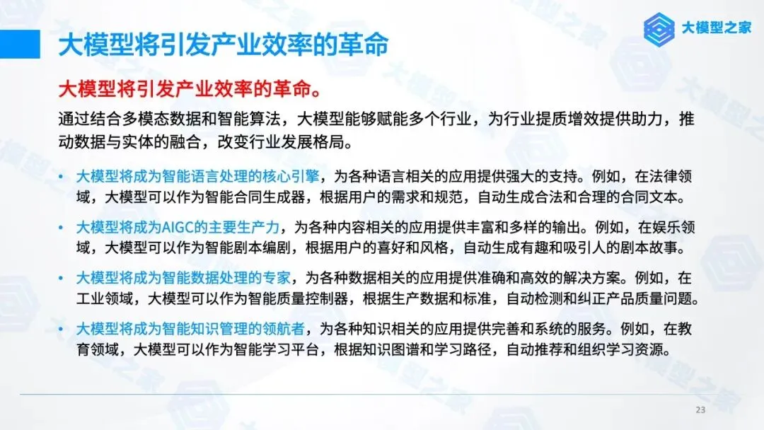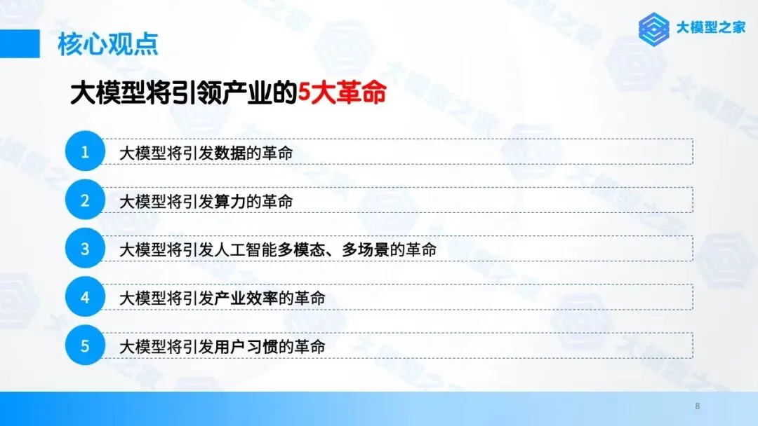 《报告》指出,大模型将引领产业的5大革命。基于深入研究,解析了人工智能大模型如何引领产业创新,提升企业竞争力,并推动社会进步。其细致入微的分析,广泛的行业案例以及深刻的结论,旨在揭示AI大模型的商业价值和市场潜力。