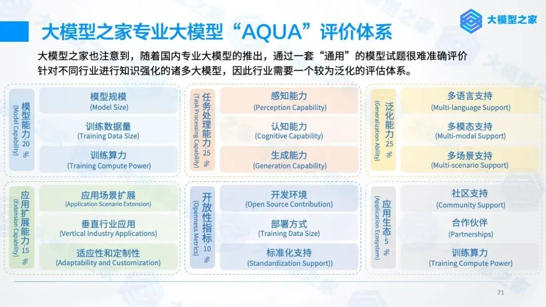 此外,《报告》特别提出专业大模型“AQUA”评价体系,从6项指标,18个维度形成对人工智能大模型的全方位,立体式的评估标准,用以帮助使用者选择更适用的大模型。