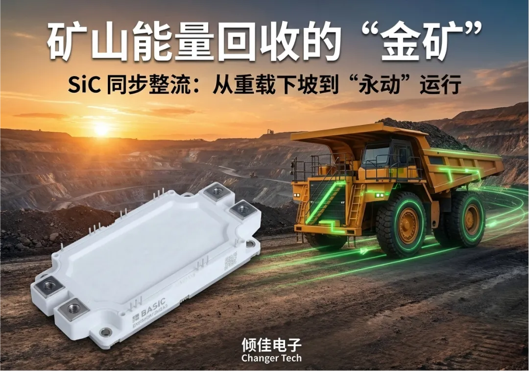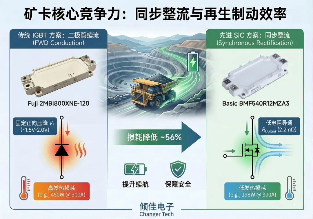 仅在单管导通损耗上,SiC就比IGBT减少了 56% 的发热。在长距离下坡过程中,这不仅意味着回收了更多电能(提升续航),更关键的是大幅降低了逆变器的温升,避免了因过热导致的制动功率降额(Derating),保障了矿卡的行车安全 。