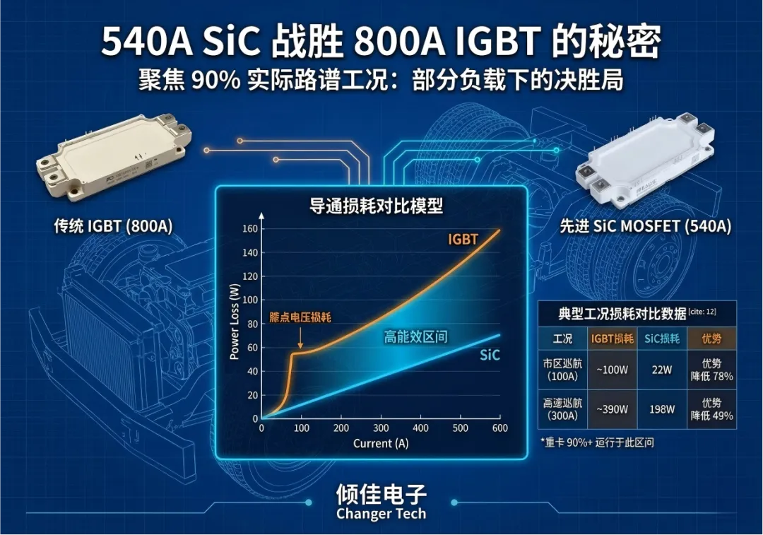 SiC电阻取25℃典型值2.2mΩ计算,高温下电阻增加,IGBT压降也增加,趋势类似。实际高温下(150℃),SiC电阻约4mΩ,在超大电流(>600A)区间,IGBT可能在导通损耗上反超,但在重卡实际路谱中,车辆90%以上的时间运行在部分负载(Part-load)区间(如100A-400A),在此区间SiC具有压倒性的效率优势 。