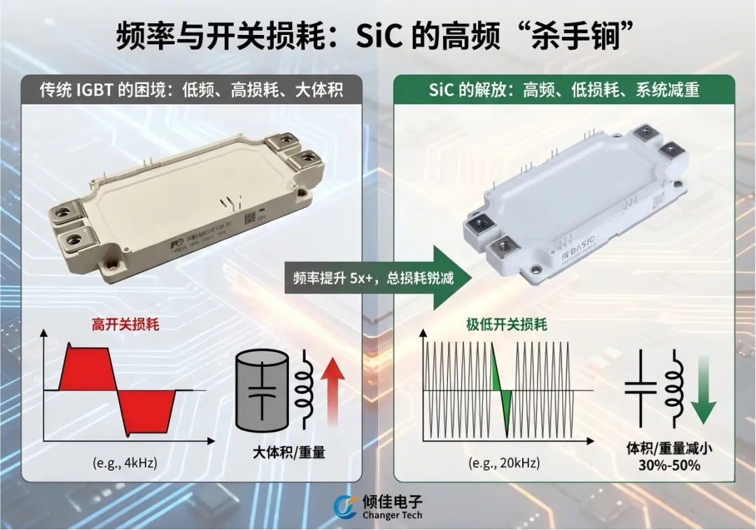 高频化使得直流母线电容和电机内部的滤波电感体积可以减小30%-50%,直接降低了电控系统的体积和重量 。
