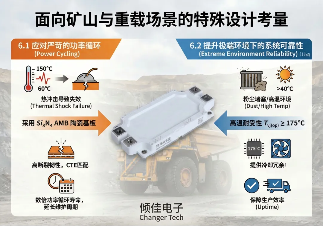 SiC模块的高温耐受性(Tvj(op)可达175℃甚至更高)为冷却系统设计提供了冗余。在矿山粉尘堵塞散热器或夏季高温(环境温度>40℃)导致冷却液温度升高时,SiC模块仍能维持正常工作,不易触发过热保护停机,从而保证了矿山的生产效率(Uptime)。