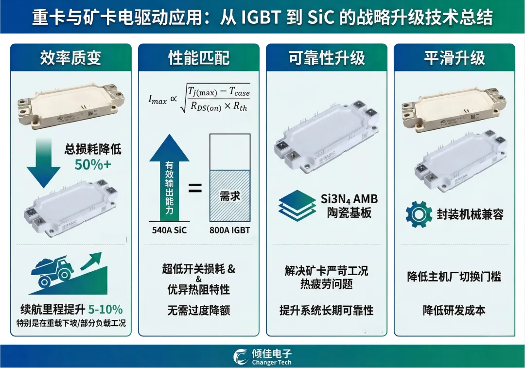 SiC方案可将逆变器总损耗降低50%以上,特别是在矿卡重载下坡和部分负载巡航工况下,节能效果显著,直接转化为续航里程的提升(预计提升5-10%)。 - 性能匹配: