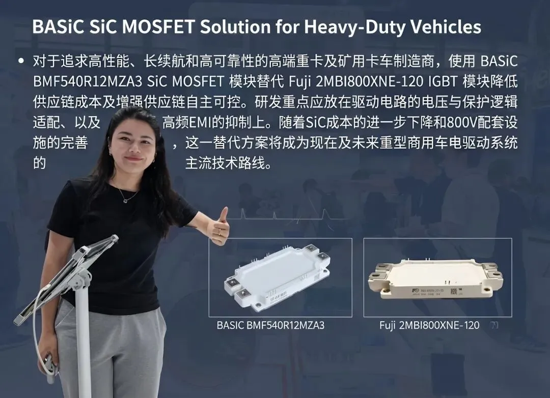 对于追求高性能、长续航和高可靠性的高端重卡及矿用卡车制造商,使用 BASiC BMF540R12MZA3 SiC MOSFET 模块替代 Fuji 2MBI800XNE-120 IGBT 模块降低供应链成本及增强供应链自主可控。研发重点应放在驱动电路的电压与保护逻辑适配、以及高频EMI的抑制上。随着SiC成本的进一步下降和800V配套设施的完善,这一替代方案将成为现在及未来重型商用车电驱动系统的主流技术路线。