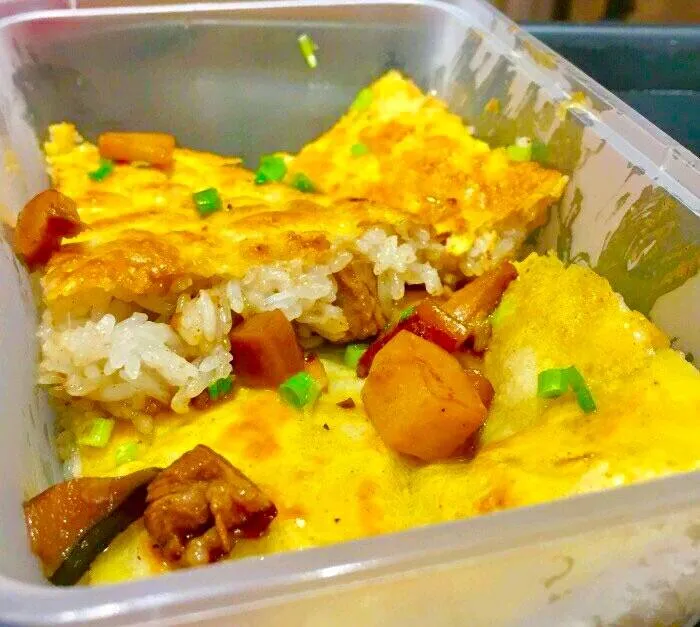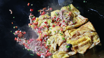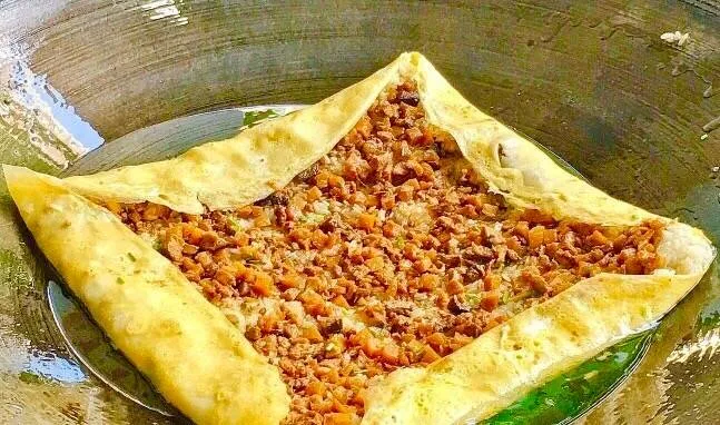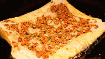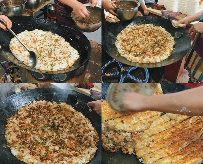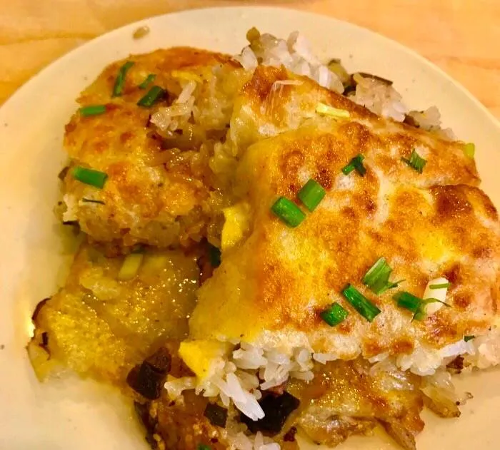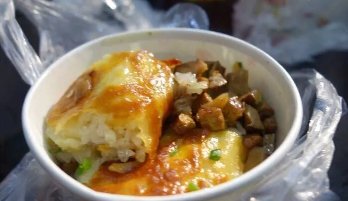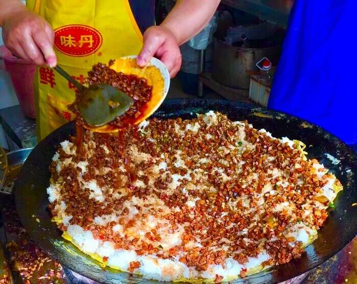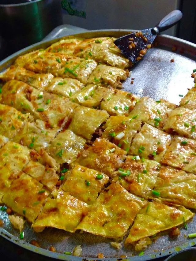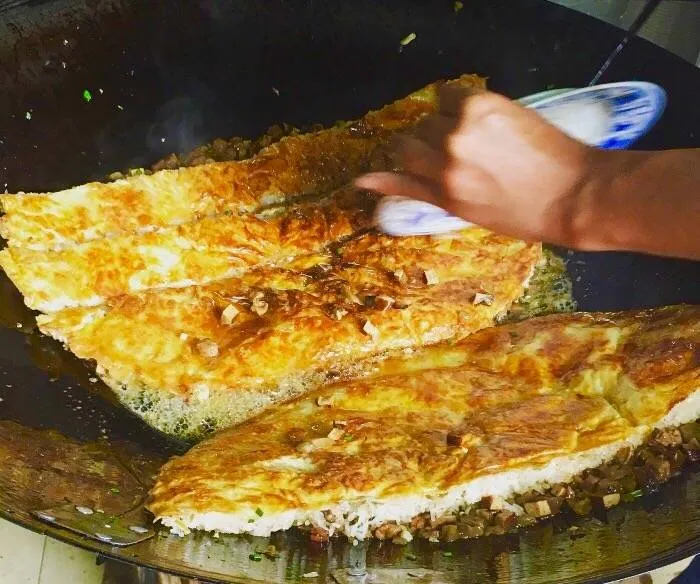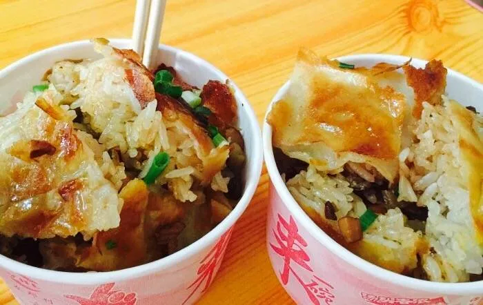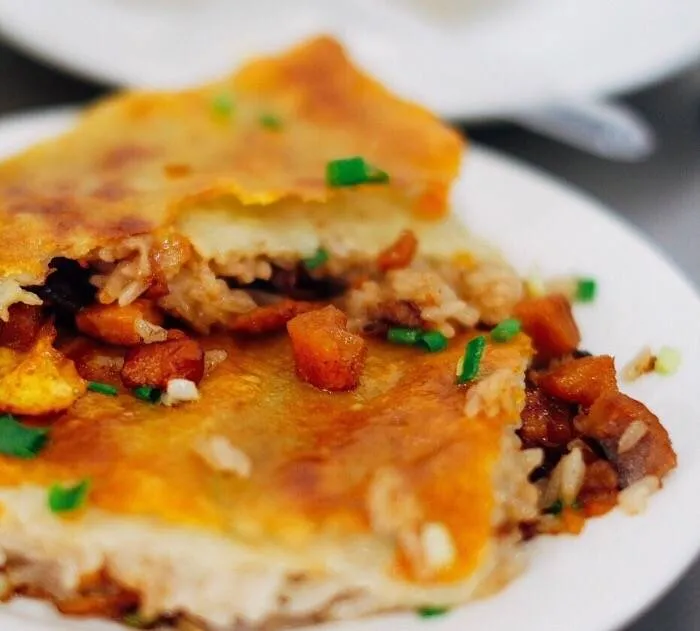 制作方法:将黄豆、大米混合磨浆,在锅里摊成薄皮,内包煮熟的糯米、肉丁、鲜蛋、香菇等馅料,用油煎制而成。
