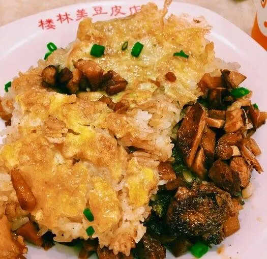 豆皮的配料非常丰富,肉丁、笋丁、香菇、腐竹……浇上卤汁很有味。吃豆皮一定要搭配他们家的桂花米酒,特别的浓的汤黏稠着各种配料,标配的汤圆换成了手撕年糕,很特别。