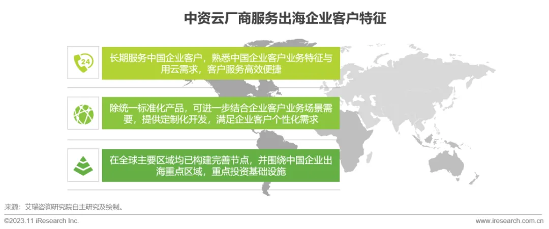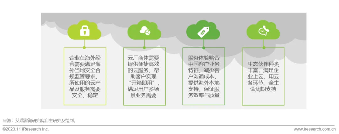 2)提供出海服务的中资背景云厂商以互联网背景云厂商为主,针对出海客群的主体:泛互联网企业,中资背景云厂商具备丰富的商业实践,因此可以立足自身积累,在技术能力上提供更贴合业务场景的精细化产品和服务,在商业发展上提供相关生态支持及发展建议。