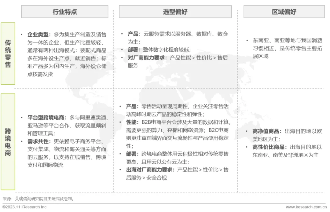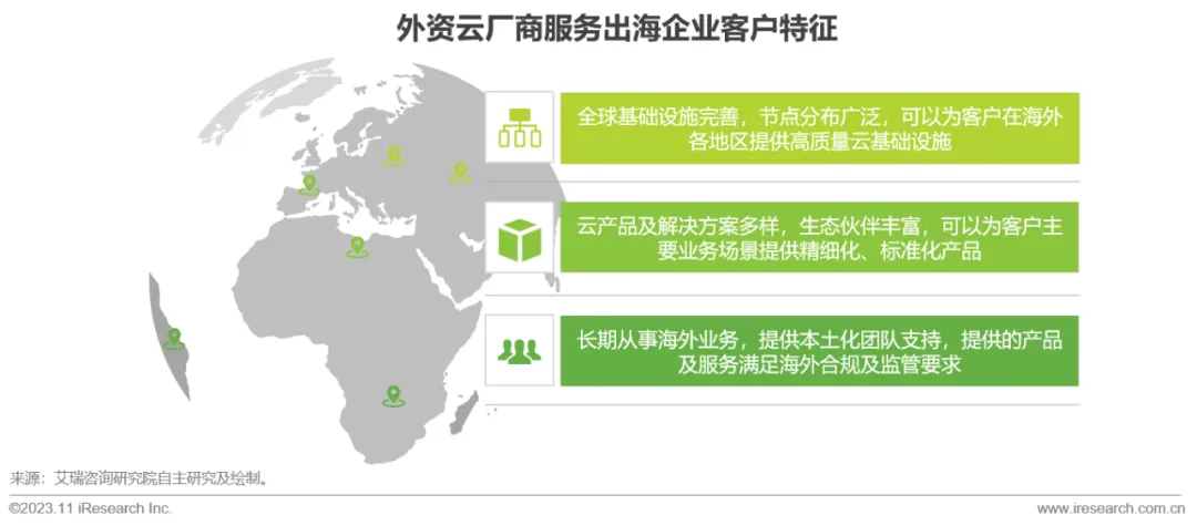 2)相较于在中国仅能提供有限的云产品及服务,外资背景云厂商在全球区域能提供更全面、完善、精细化的云产品供出海客户使用;同时,相较于国内云厂商更聚焦于服务互联网出海客户,外资背景云厂商能为更多传统行业客户如金融、零售、制造、能源等企业提供更多样的出海云服务支持;此外,使用外资背景云厂商产品的出海企业客户,可以以云平台为媒介,进一步接入云厂商所在广泛生态体系,不仅利用云作为技术支持,更可以获得业务拓展的相关支持。