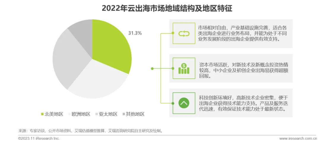 北美地区是中国云出海市场营收贡献占比最高区域。从需求侧角度看:在业务初期,北美地区科技创新氛围活跃,为各类内容创新、知识创新、技术创新型企业提供更为完善的基础设施及配套生态,有助于新概念加速落地、新技术快速迭代;在业务加速期,除了在能力上为创新提供支持,北美地区资金充足,且资本市场对各类创新概念较为青睐,企业容易获得外部投融资,为研发投入、产品更新、业务拓展提供必要资金支持;在业务成熟期,北美客户相较其他区域有更强的消费能力,能帮助出海企业更易收获超额回报。因此,虽然北美地区出海业务相较于其他区域需要更长的建设周期,但以北美为主要出海目的地的企业更愿意承担潜在时间与资金风险。从供给侧角度看:全球主要头部云厂商及科技企业的业务中心均集中在北美,可以为出海客户提供更为完备的本土支持,云厂商的新产品与新服务也更早在北美地区落地,便于出海客户能迅速利用最新的能力工具提升生产效率。
