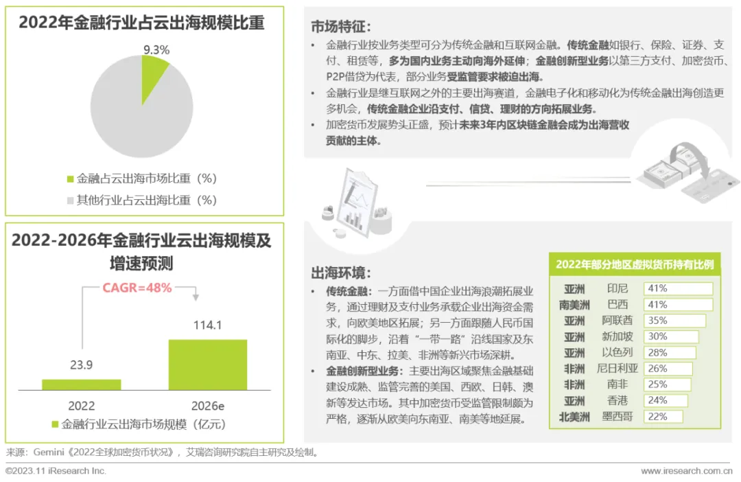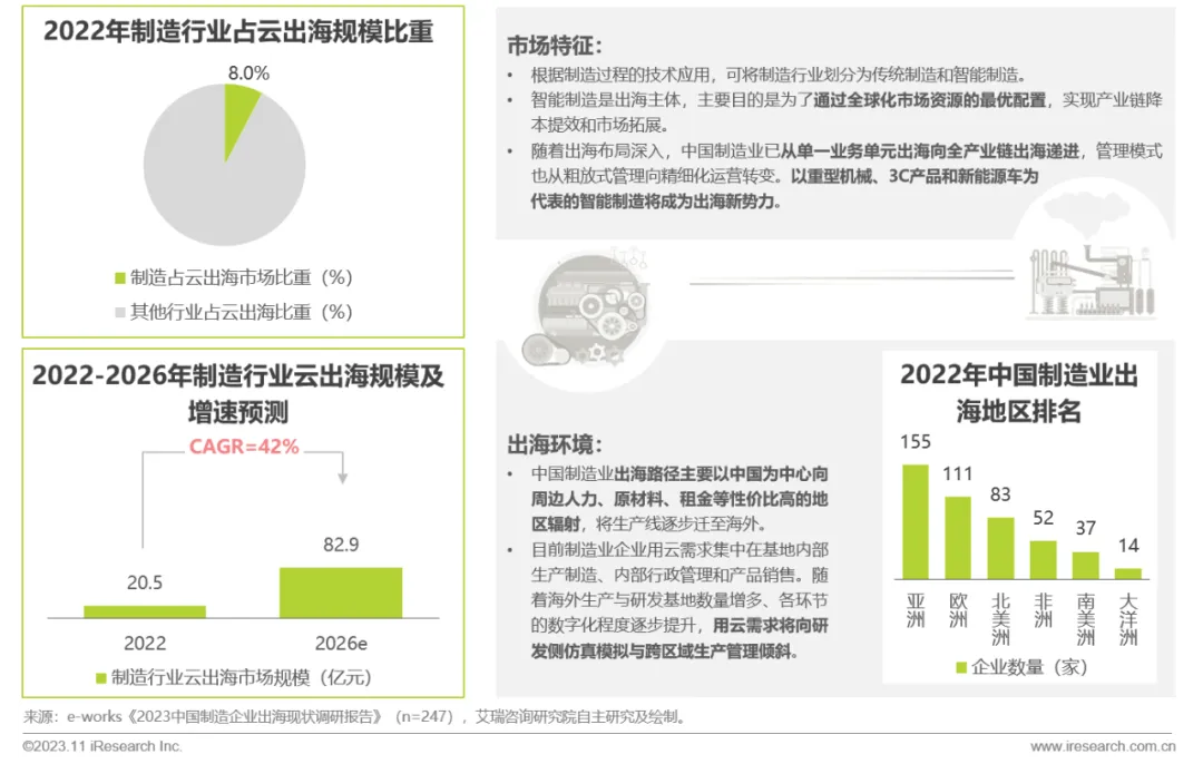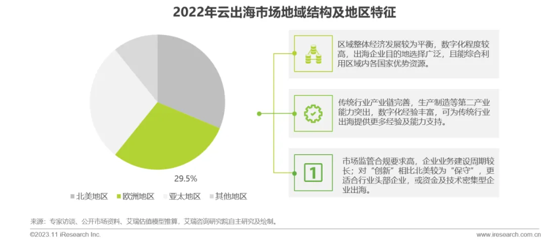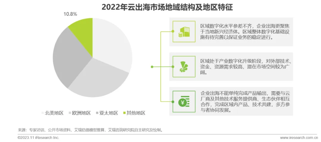 行业特征:从地域结构看,欧美地区是中国云出海市场营收贡献的主要来源,但欧美云出海市场更多是存量客户为主。云出海市场增量空间则主要来源于东南亚、中东、拉美等新兴市场。从行业结构看,互联网行业是中国云出海市场的主体。传统行业整体加速海外业务布局,金融、制造行业逐步成为传统行业出海重点。