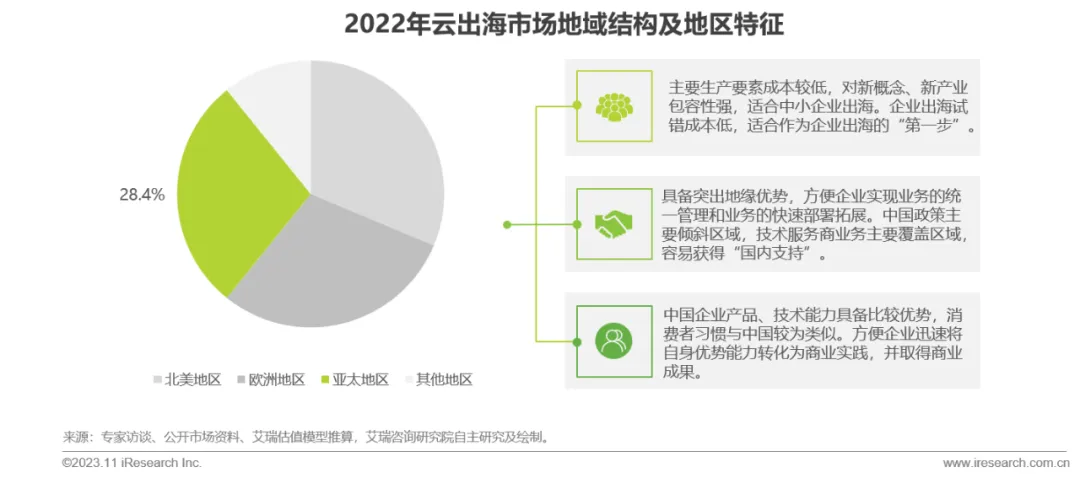 欧美地区数字化基础设施完善,市场机制成熟,行业监管严格。企业向欧美地区出海的资金、技术门槛较高,项目建设周期较长。从需求侧角度看,中国出海企业逐步将亚太地区(如东南亚、中东)作为出海首选目的地,以便用更低的运营成本实现更高效的业务搭建,并在不影响业务推进的前提下保留充足的“试错空间”。从供给侧角度看,欧美地区虽然是云厂商出海业务营收的主要来源,但欧美地区云市场格局稳固,云业务更多是存量客户持续用云投入,新客增长有限且拓客成本较高。因此,云厂商也逐步将云业务布局重点转向亚太地区及其他新兴经济体,以此来拓展增量空间。未来,在亚太地区及其他全球新兴市场,云厂商会加速完善云基础设施布局,升级对区块链、元宇宙、NFT、AI、IoT等新业态的激励计划,强化区域业务及技术生态体系,进一步在新兴市场中塑造差异化竞争优势,在新赛道中构筑先发优势。
