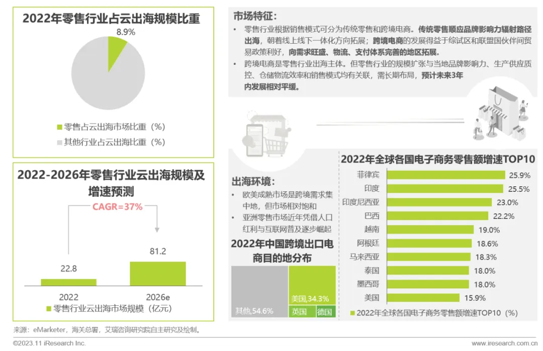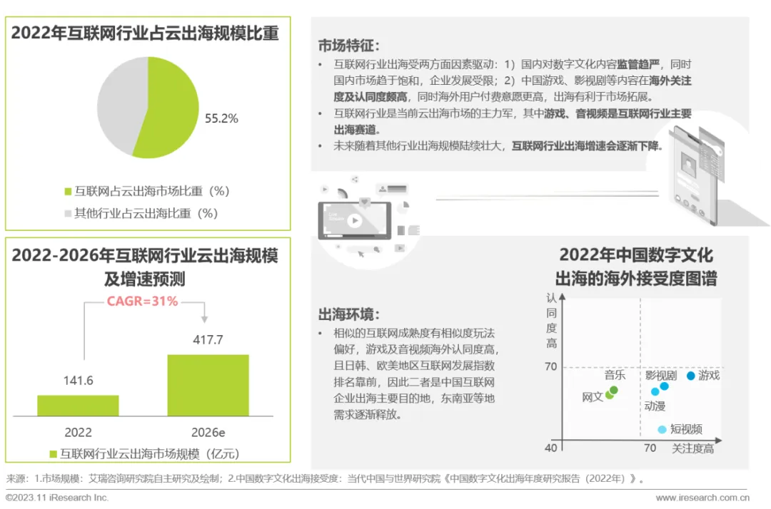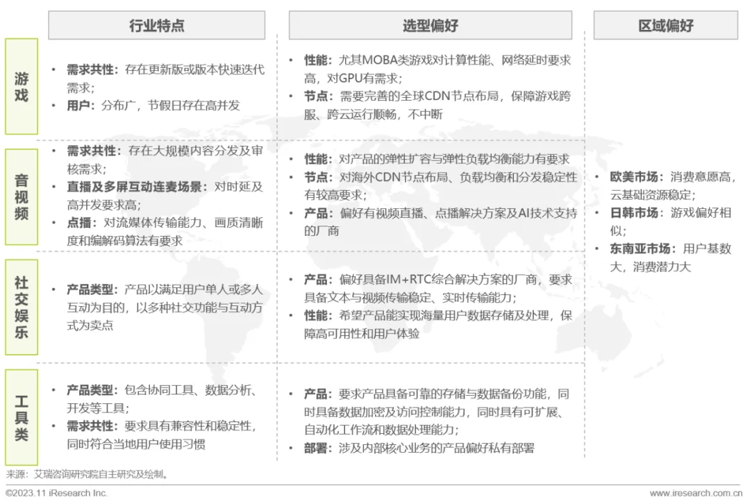 发展背景:从需求方角度看,1)中国互联网行业市场趋于饱和,以游戏、音视频为主的数字内容生产者通过出海寻找业务增长空间。2)传统行业数字化成果颇丰,行业头部企业及行业新势力,通过产业链外移和全球化资源配置,进一步实现降本增效。从供给方角度看,中国整体云市场增速趋于缓和,云厂商通过海外市场拓展营收来源。