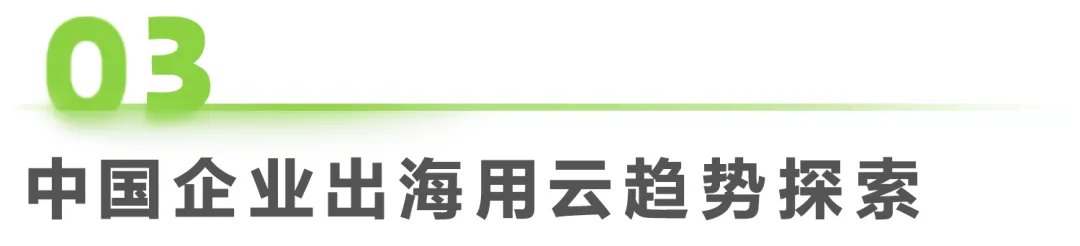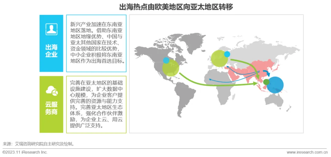 发展趋势:从出海地域分布看,出海热点逐步从欧美地区向亚太地区转移。一方面,云厂商加速在东南亚地区基础设施建设;另一方面,中国出海企业倾向于将东南亚地区作为出海第一站,将更多新兴业务优先部署在东南亚地区。从出海业务类型看,中国企业出海内容日渐丰富,从人力、资源出海向技术、资金出海升级;从单纯的数字内容出海,向“数实并重”出海转型;从单一的生产要素出海,向产业链整体迁移转变。