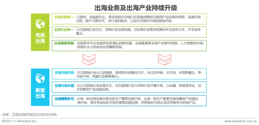 相较于国内更注重“数实结合”,强调技术能力要有效支持实体经济,产品能力要具备更强的实践性,海外市场(尤其是新兴经济体)则对仍处在雏形阶段的新概念、新内容、新技术具有更强的包容性,提供更多的激励计划以吸引初创企业或开发者。伴随区块链、元宇宙、生成式AI等新热点的不断涌现,游戏设计、音视频内容的日益丰富,许多科创企业逐步尝试将海外市场作为其新创意的“试验田”,推动新兴产业出海。此外,在中国产业数字化升级进程中涌现的“行业新势力”和传统行业中数字化基础较为雄厚的头部企业,逐步将数字化能力推广到其全球化业务运营和供应链管理中,以更有效地挖掘和利用全球优势资源。例如,中国智能制造、智能汽车等行业已逐步将其产业链中的部分要素转移到海外,从单纯的制成品出海向生产要素出海转变。