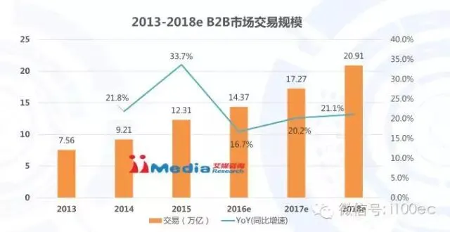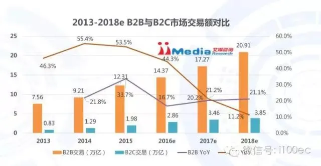 2016年6月3日,艾媒咨询发布《2016年中国B2B行业投资报告:机遇与趋势》。分析师预计B2B市场规模在未来数年内仍将维持平稳增长,并将在2018年超过20万亿;另外,B2C市场规模增速在2014年达峰值后,市场逐步进入成熟期,到2018年增速将下降至11.2%,但同期B2B的增速仍能维持在20%左右的较高水平。