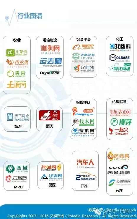 目前在B2B市场包括综合类的阿里巴巴、生意宝、环球资源、慧聪网、焦点科技、环球市场、金泉网、中国网库等;钢铁类的上海钢联、中钢网、钢之家、钢宝股份、找钢网等;服纺类的中国服装网、环球鞋网、网上轻纺城、搜布等;化塑类的找塑料网、环球塑化网、奇化网、快塑网、找化工网、化塑汇等;农业类的小农女、美菜、有菜、链菜、云农场等;旅游类的票管家、旅游圈、真旅网等;快消类的易酒批、品尚汇、进货宝、掌合天下等;医药类的珍诚医药、商康网、药给力等;印包类的中国包装网、七彩云、阳光印网等;IC元器件类的华强电子网、维库电子网、亿采网等。