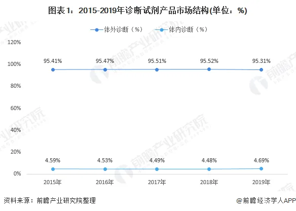 诊断试剂可分为体内诊断试剂和体外诊断试剂两大类。从近年来的诊断试剂产品结构可以看出,体外诊断试剂市场份额均在95%以上,体内诊断试剂产品市场份额均低于5%。受医保控费影响,国内医疗机构15%药品加成逐步取消,诊断等医疗项目“此消彼长”。前瞻认为体外诊断(IVD)行业有望受益于医改的大趋势,长时间保持较快的成长速度。