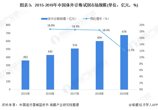 近几年随着医疗保障的投入、消费水平的提高,我国体外诊断试剂行业已经进入成长期,具备一定的市场规模。2015-2019年我国体外诊断试剂行业市场规模不断增加中国医疗器械蓝皮书统计数据显示,2018年我国体外诊断试剂市场规模为604亿元,初步估算,2019年我国体外诊断试剂市场规模为678亿元。