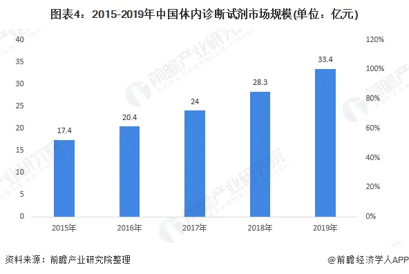 相对于体外诊断试剂市场,我国体内诊断试剂市场规模相对较小,市场增速较为稳定。2015-2019年我国体内诊断试剂规模不断增加,初步估算,2019年体内诊断试剂市场规模约为33.4亿元。