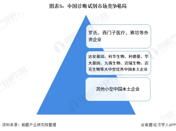 从我国诊断试剂行业总体市场竞争格局来看,外资企业凭借其中高端领域的技术优势以及在中高端领域的“仪器+试剂”一体化平台垄断,罗氏、西门子医疗、雅培等外资企业占据了50%以上的市场份额,市场竞争较为激烈。