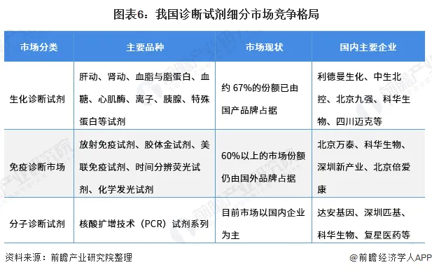 诊断试剂行业细分领域较多,不同领域的企业竞争格局也有所差别,以目前最为常用、规模最大的生化诊断试剂、免疫诊断试剂和分子诊断试剂来看,目前生化诊断试剂和分子诊断试剂领域均已国内企业为主,而免疫诊断试剂市场方面,国外品牌占据主导。具体来看: