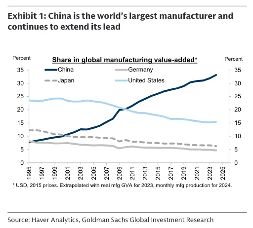 高盛在2025年10月19日发布的中国战略报告中指出,中国出口故事已经发生根本性演变。传统的"中国作为低成本、低附加值制造商"的认知已经过时,中国正在向新兴市场销售更多产品,在高端制造业领域获得全球市场份额,并向世界出口服务、知识产权和文化。