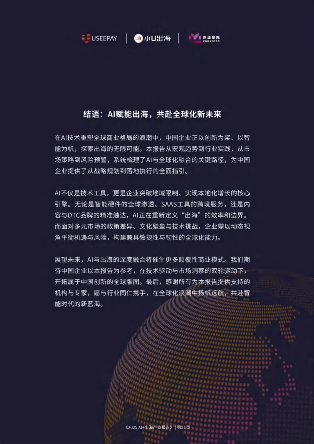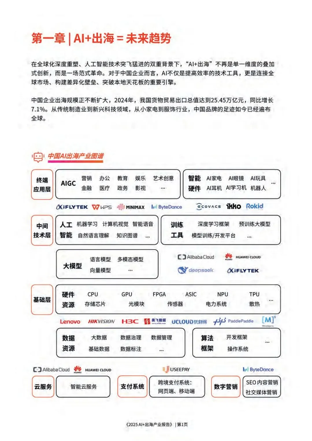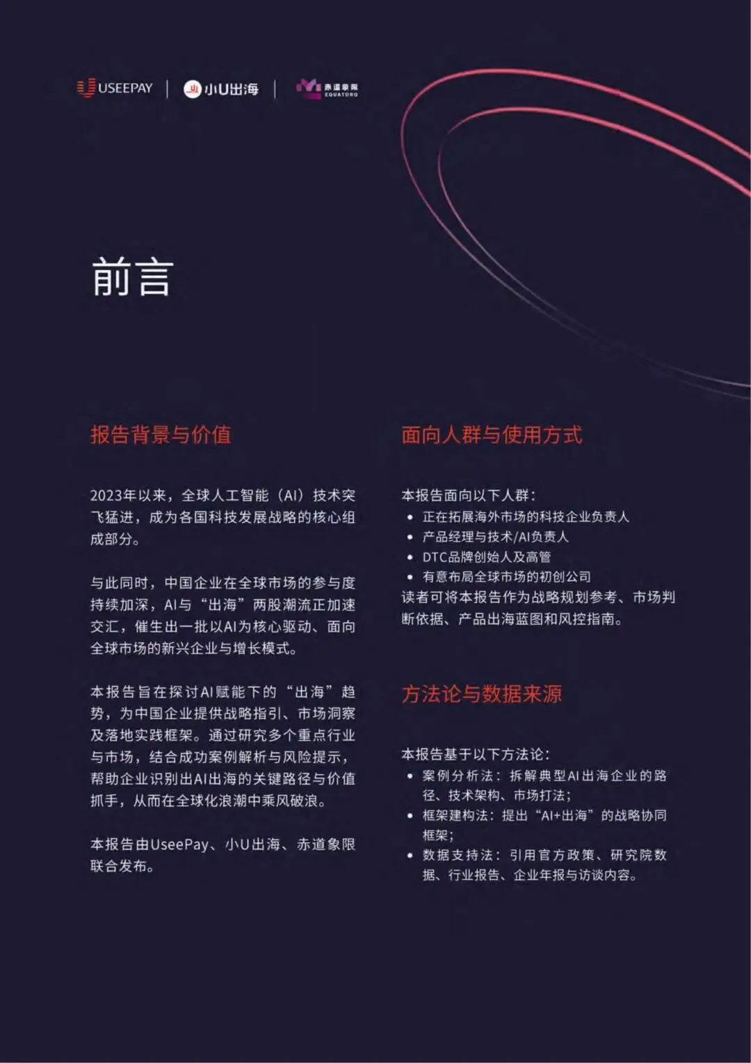 本报告旨在探讨AI赋能下的“出海”趋势,为中国企业提供战略指引、市场洞察及落地实践框架。通过研究多个重点行业与市场,结合成功案例解析与风险提示,帮助企业识别出AI出海的关键路径与价值抓手,从而在全球化浪潮中乘风破浪。