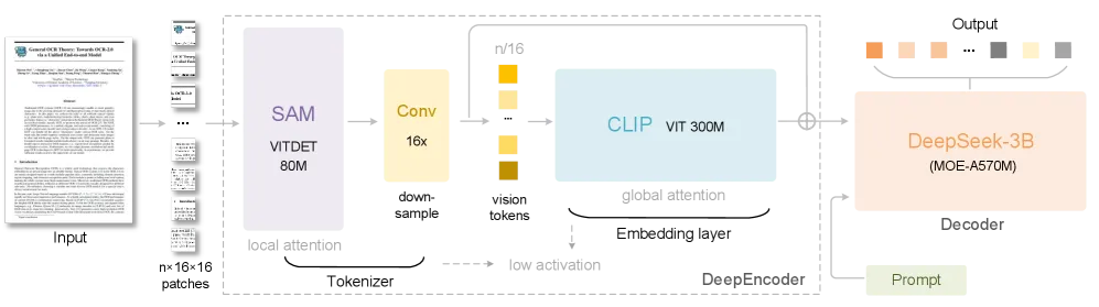 SAM-base (ViTDet 80M):利用 Segment Anything Model 的窗口注意力机制处理高分辨率输入图像(切分为 16x16 patch),提取局部视觉特征,激活内存占用低。 16x 卷积压缩器:在 SAM 输出后,通过一个两层卷积网络进行 16 倍下采样,大幅减少 Token 数量(如 1024x1024 输入从 4096 压缩至 256)。 CLIP-large (ViT 300M):移除 patch embedding 层,接收压缩后的 Token 序列,利用其全局注意力机制提取高级视觉知识。 该设计旨在平衡高分辨率处理能力、低激活内存占用和少量视觉 Token 输出,并支持多种分辨率输入模式(Tiny/Small/Base/Large/Gundam 等)。