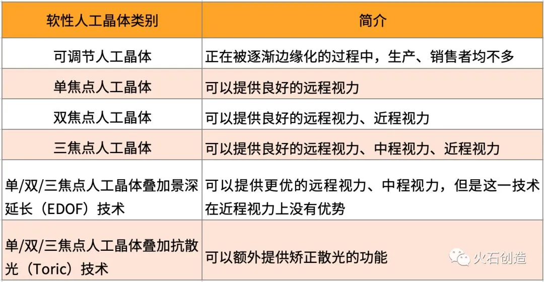 声明:本文为火石创造原创文章,欢迎个人转发分享,网站、公众号等转载需经授权。人工晶体中硬性人工晶体价格在几百元左右,而软性人工晶体价格在万元左右,也成为市场主要盈利点,是医疗器械企业争相竞争的领域。目前国内市场中,本土企业占据了绝大多的低端硬性人工晶体市场,而欧美企业基本垄断软性人工晶体市场。人工晶体(IOL),是经手术植入眼睛里代替摘除的自身混浊晶体的精密光学部件,一般分成硬性人工晶体与软性人工晶体两大类。硬性人工晶体较为低端,价格在几百元人民币上下浮动;软性人工晶体较为高端,价格在千万元人民币之间浮动。现在,软性人工晶体是市场的主要盈利点,也是各家医疗器械企业争相竞争的领域。表1 软性人工晶体类别简介