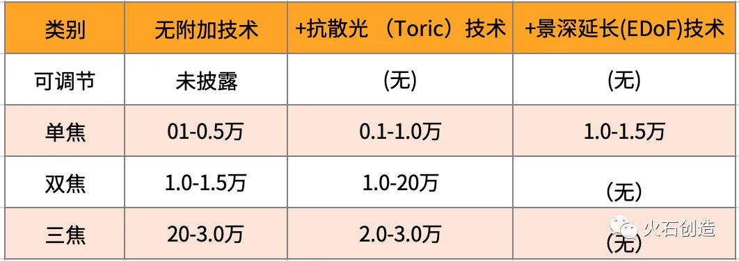 此外,国外亦有同时叠加抗散光(Toric)技术和景深延长(EDOF)技术的人工晶体,比如AMO公司(被强生收购)旗下的Techis Symfony Toric人工晶体。根据软性人工晶体的价格高低,可以将各类软性人工晶体归纳,见表2。表2 软性人工晶体价格范围
