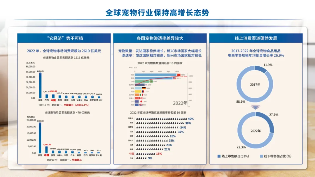 尽管我国宠物行业发展迅猛,宠物产品全球市场份额占比较高,但与美欧成熟的宠物市场相比尚处于初级阶段,呈现出市场渗透率、行业规范性、市场集中度相对较低等特点。宠物“缺医少药”、企业产品服务质量良莠不齐、高端创新要素相对缺乏、行业标准有待建立完善等行业发展痛点,对宠物行业的高质量发展带来严峻挑战。