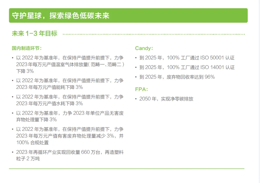 图:海尔智家的2023年期与2025年期环境目标,很清楚是在温室气体、能耗、水耗、废弃物、有害废弃物、塑料这6个因子上寻求改善。图片截取自:海尔智家2022年度ESG报告